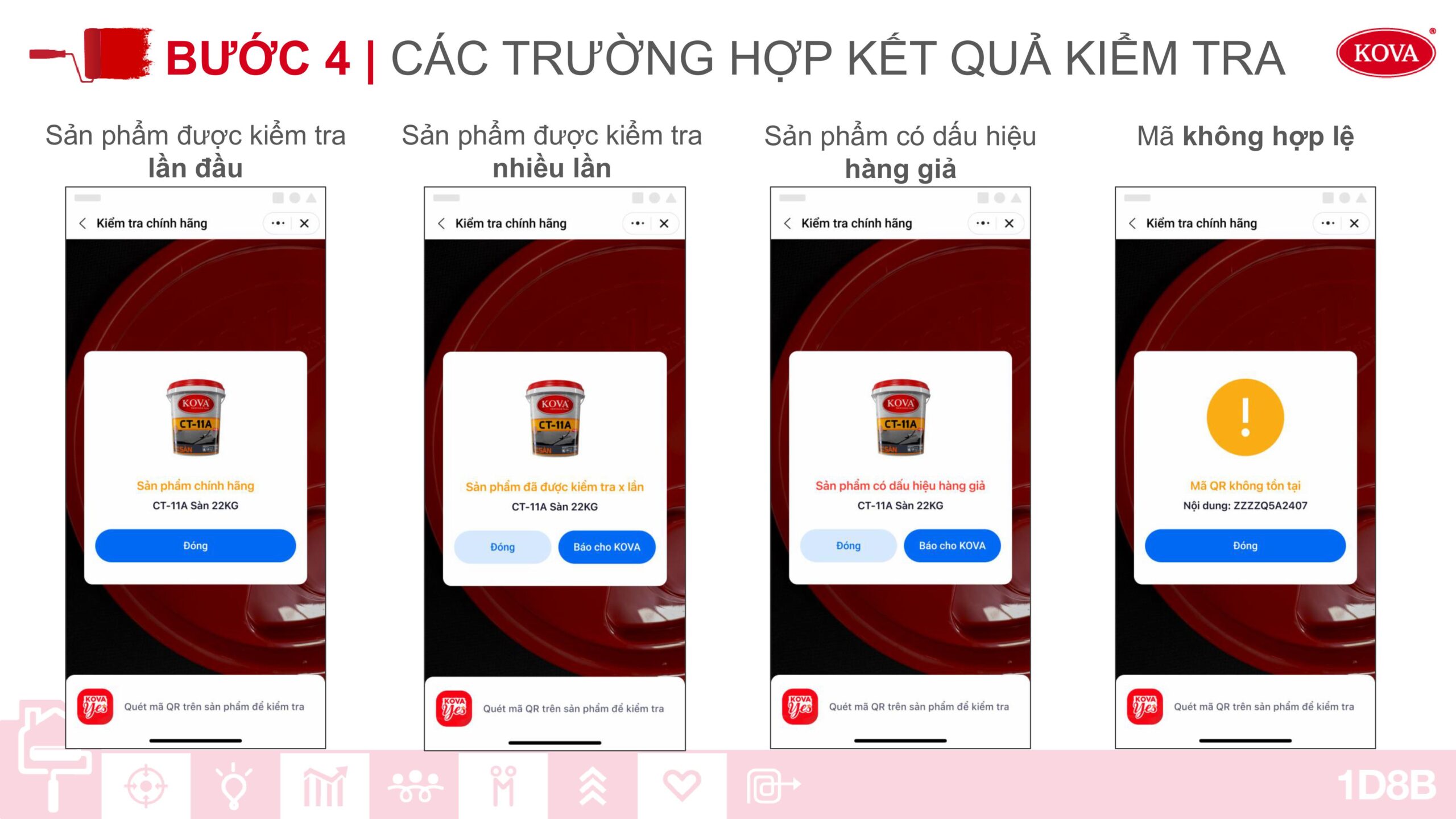 Bắt đầu từ 1/4/2025, quý khách hàng có nhu cầu kiểm tra hàng chính hãng, vui lòng sử dụng công cụ kiểm tra hàng chính hãng KOVA trên ứng dụng Zalo bằng cách truy cập công cụ và quét mã QR được in trên nắp sản phẩm (*Lưu ý: việc quét mã QR trên nắp sản phẩm để xác nhận hàng chính hãng không ảnh hưởng đến việc quét mã tích điểm Yes của Cửa hàng)