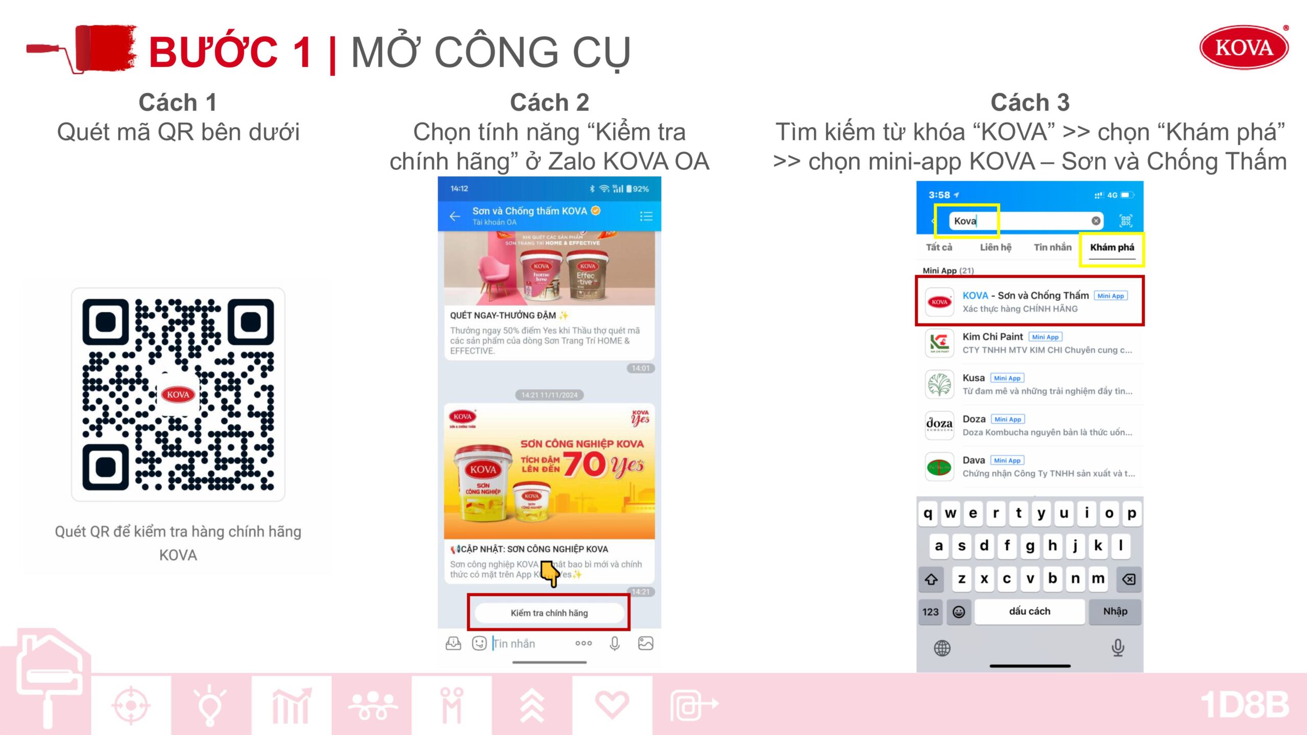 Từ 1/4/2025, Zalo mini app KOVA-Sơn và Chống Thấm là công cụ kiểm tra hàng chính hãng KOVA duy nhất.