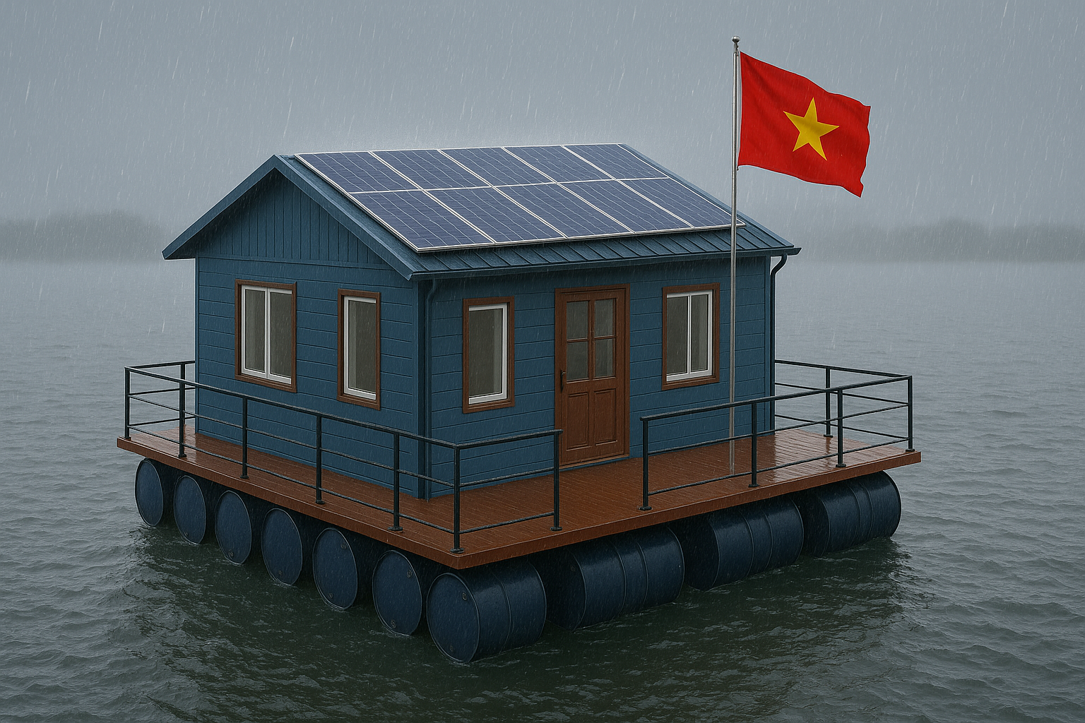 Kết cấu nổi: Toàn bộ công trình được nâng đỡ bởi hệ thống thùng phi D1000. Các thùng này không chỉ tạo lực nổi mà còn có thể được tận dụng như kho chứa nước sạch, lương thực, hoặc vật tư thiết yếu, đáp ứng nhu cầu dự trữ tối đa 30 ngày.
